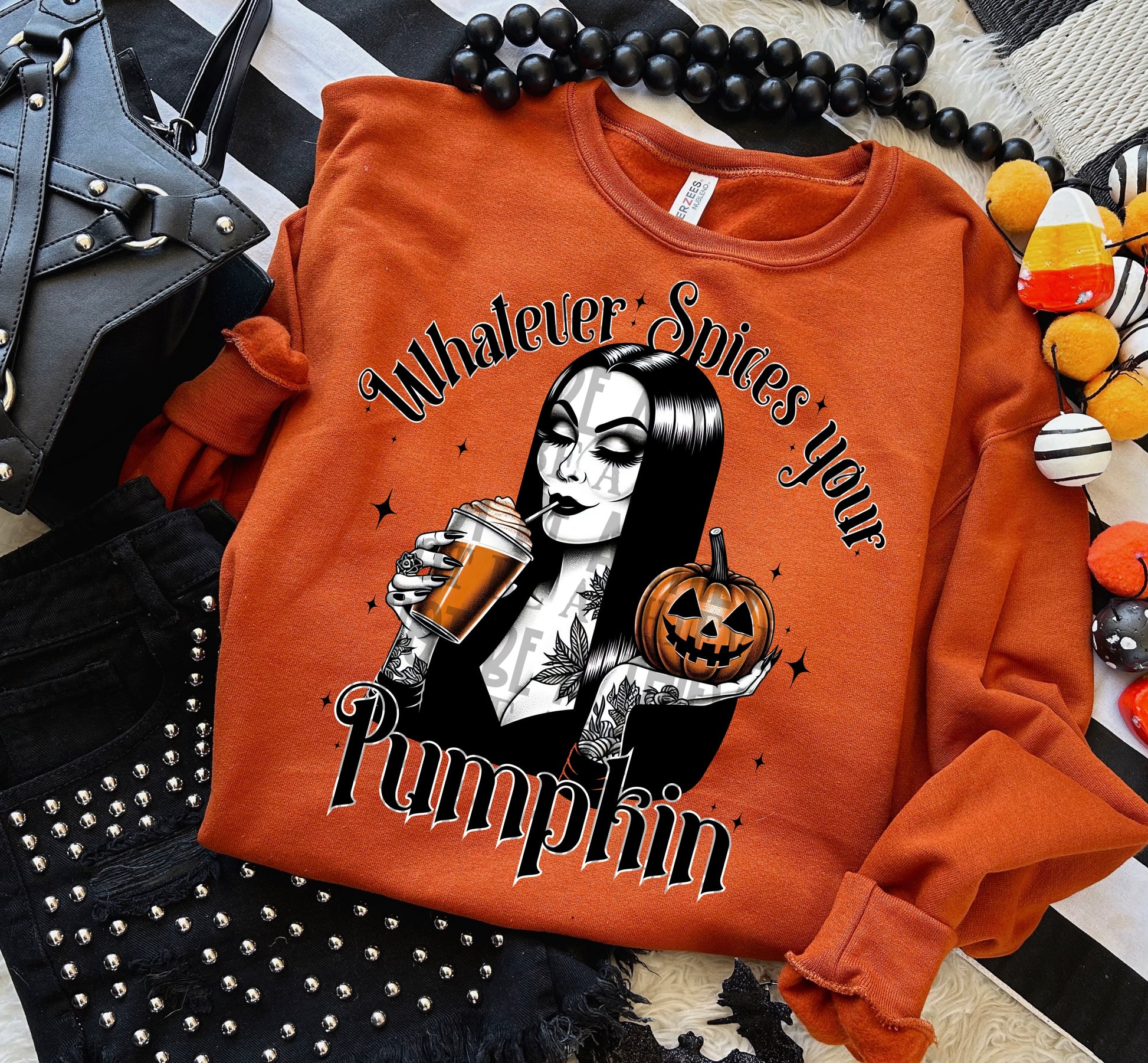 Whatever spices your pumpkin Morticia black stars- DTF TRANSFER (EDD)